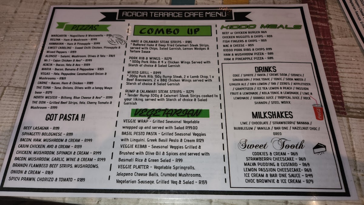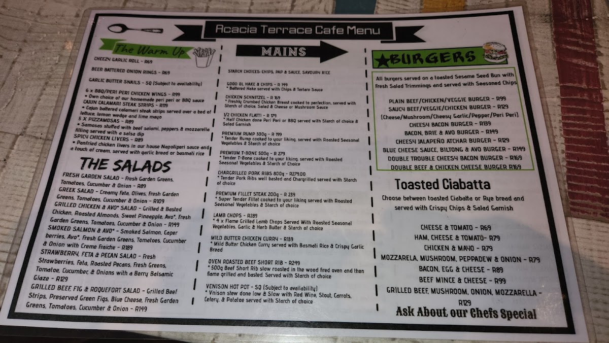 Acacia Terrace Café, nestled within The Kingdom Resort in Pilanesberg National Park, offers a relaxed yet refined dining experience. The menu impresses with its diverse range, from hearty buffet breakfasts to expertly cooked fillet steaks praised as the best in the area. Guests delight in generous portions of classics like pasta, pizza, and succulent burgers, all crafted with care. The café’s poolside cocktails add a refreshing complement to the meal, enhancing the overall ambiance.